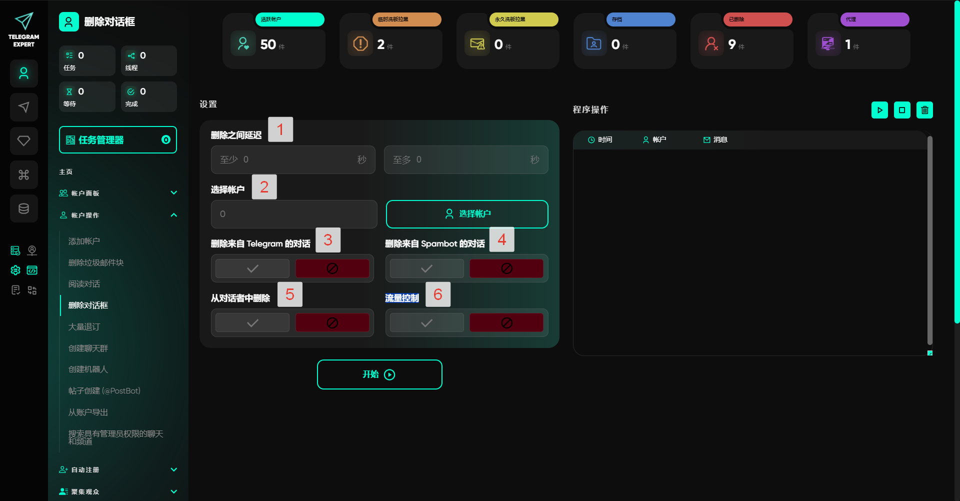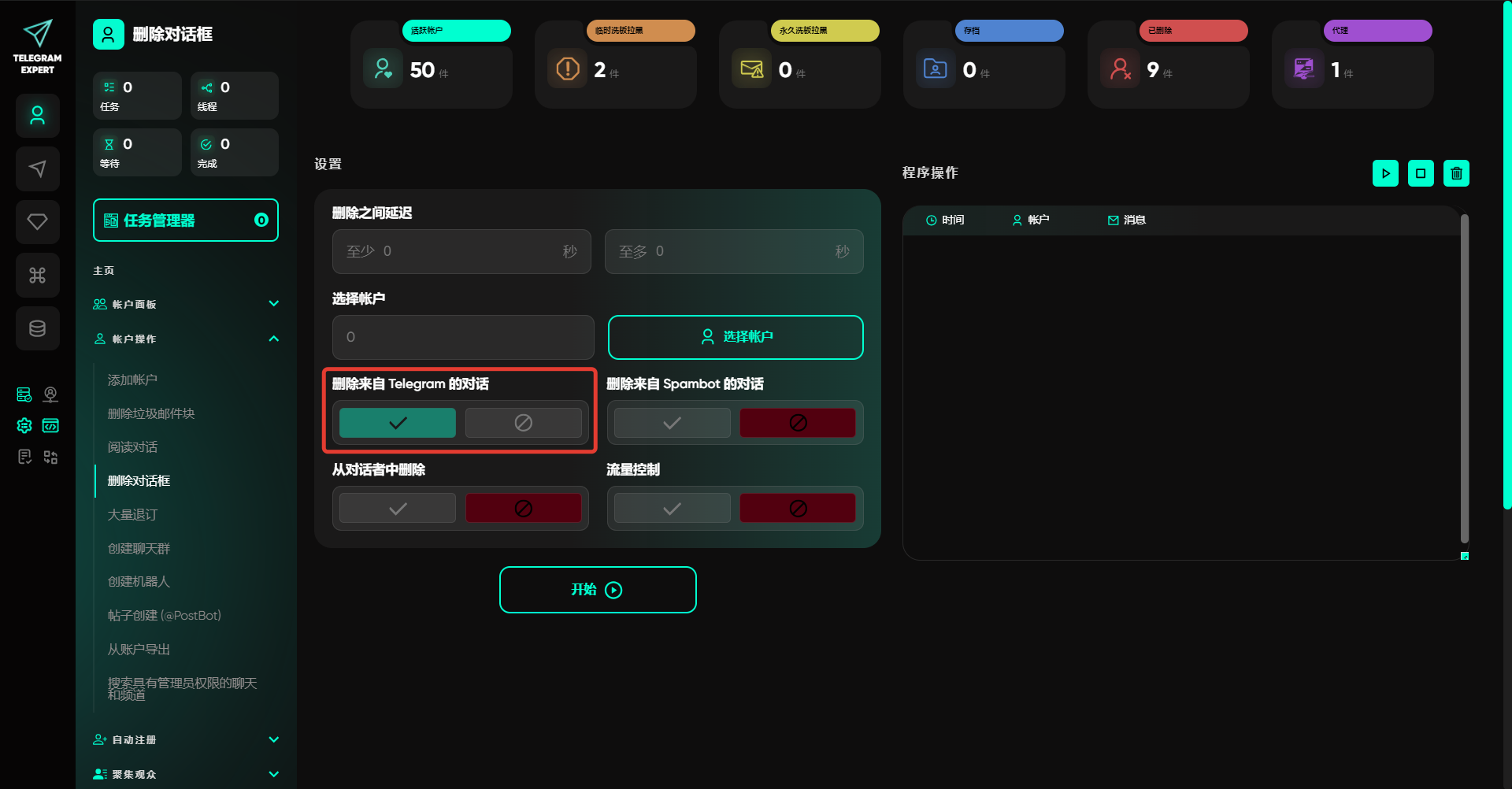 3. 删除来自 Telegram 的对话 — 若账户中存在与Telegram的对话,启用此项后将一并删除该对话。