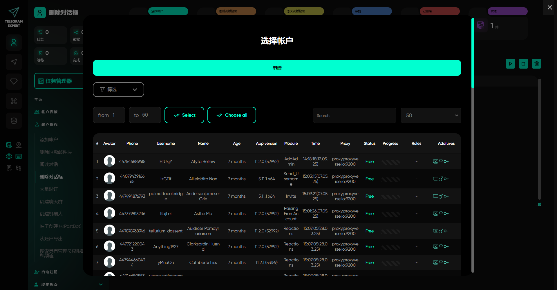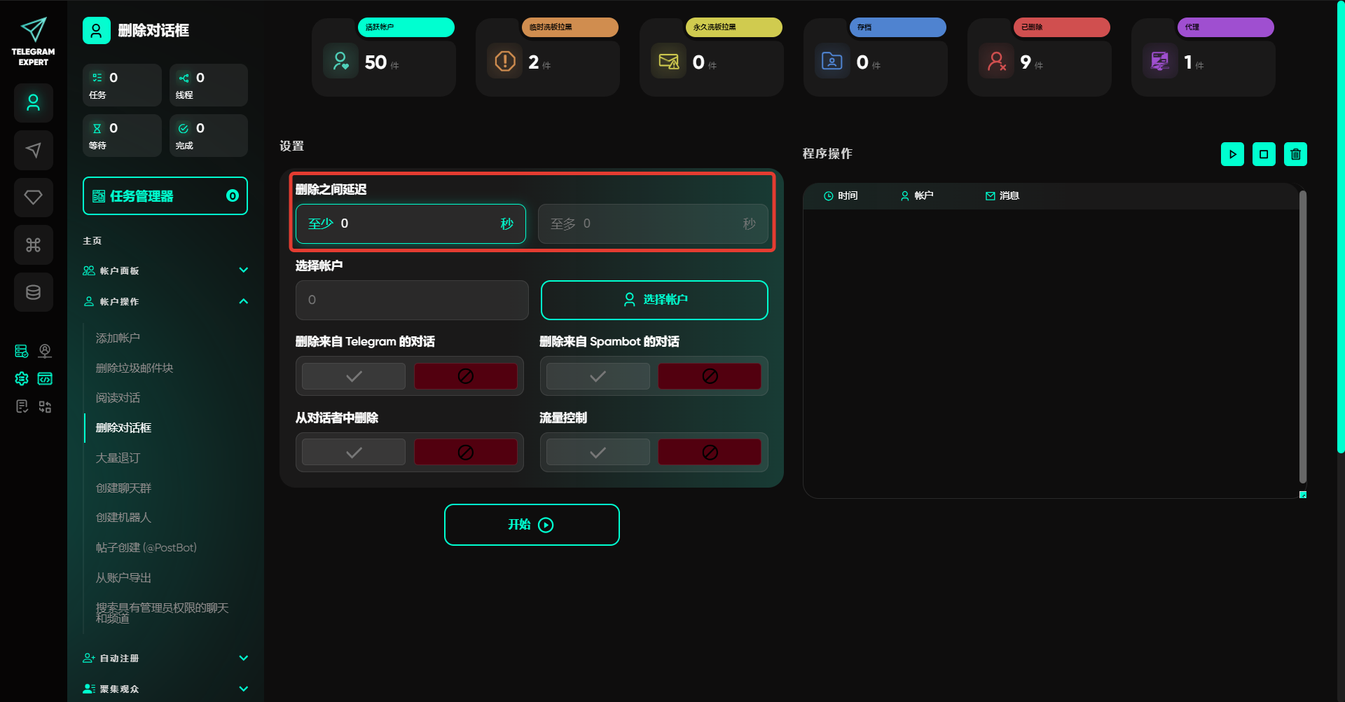 删除对话框模块可用于清理账户中的对话内容。此功能适用于清空账户历史,避免堆积无用对话,或在您准备出售该账户时使用。